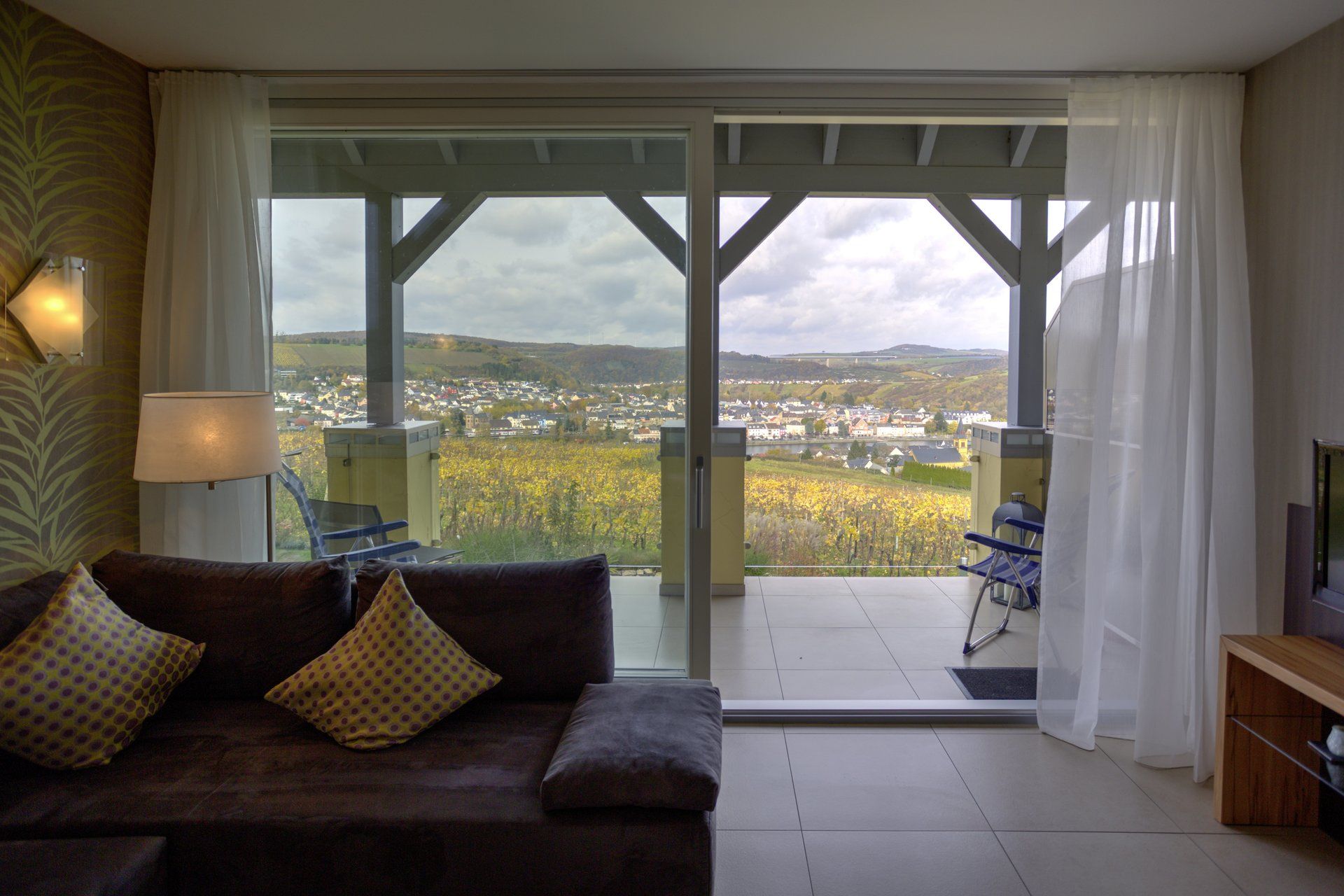 - Wohnraum (mit TV) mit traumhaftem Panoramblick auf die Sauer-Moselmündung